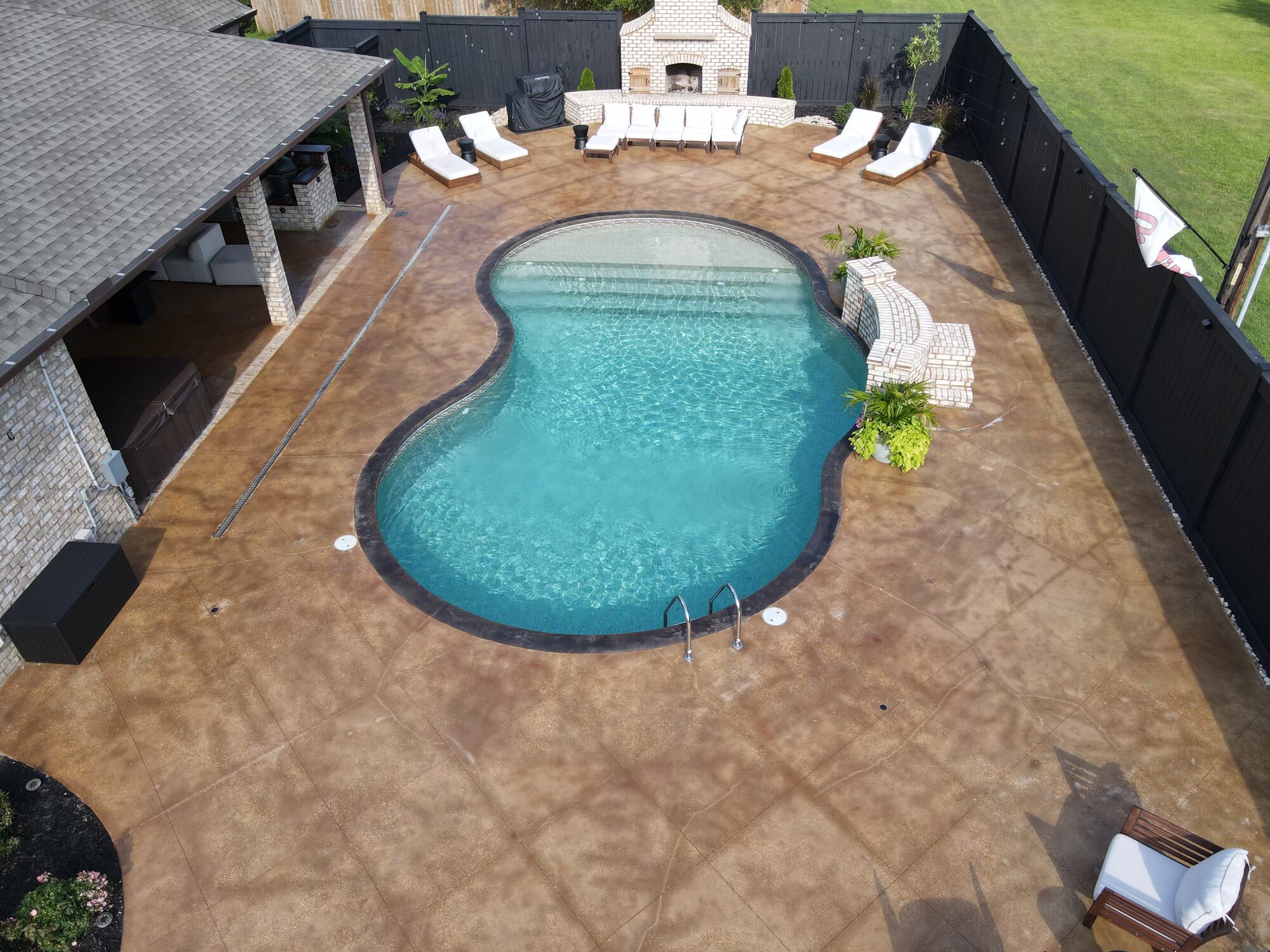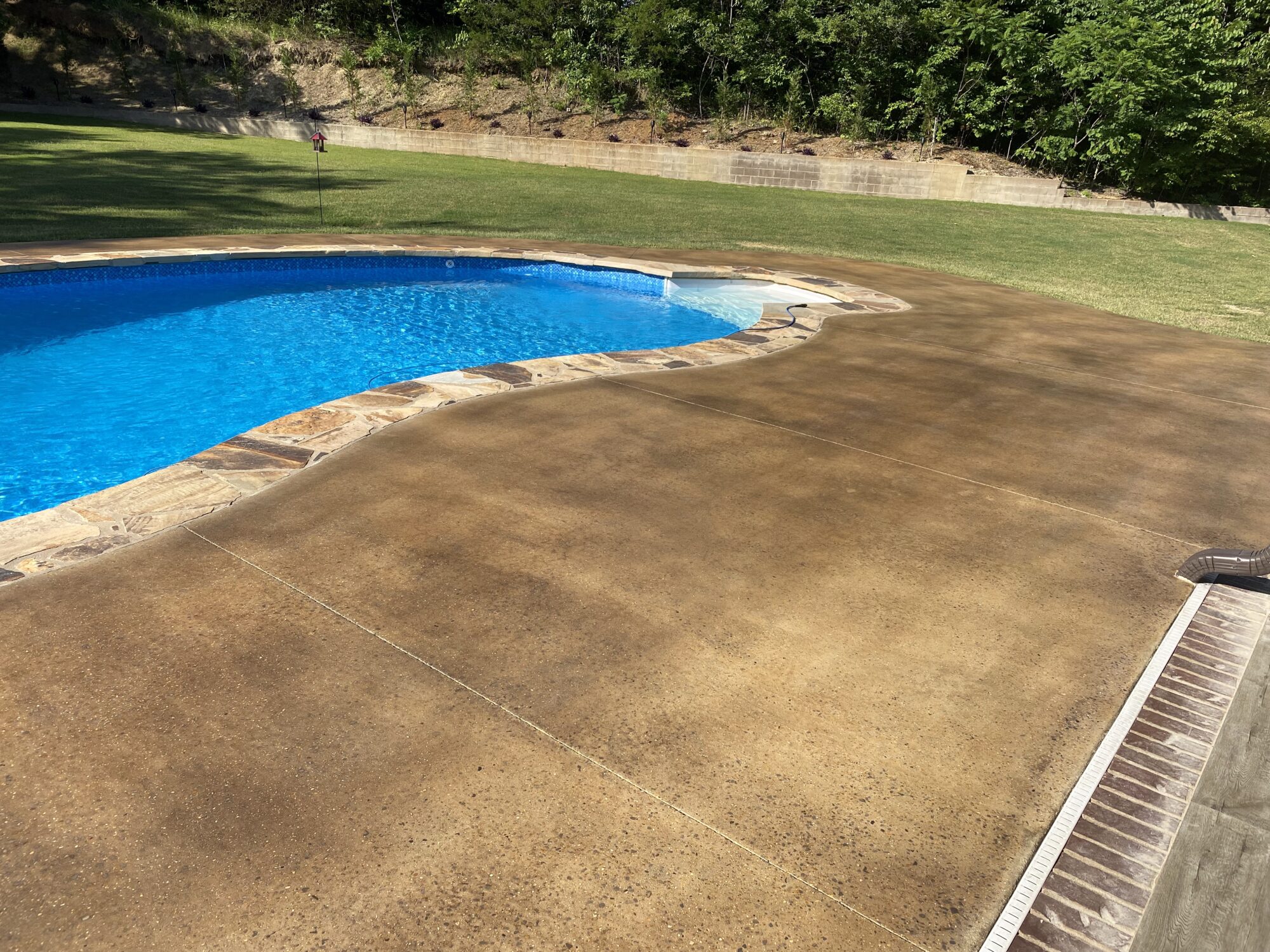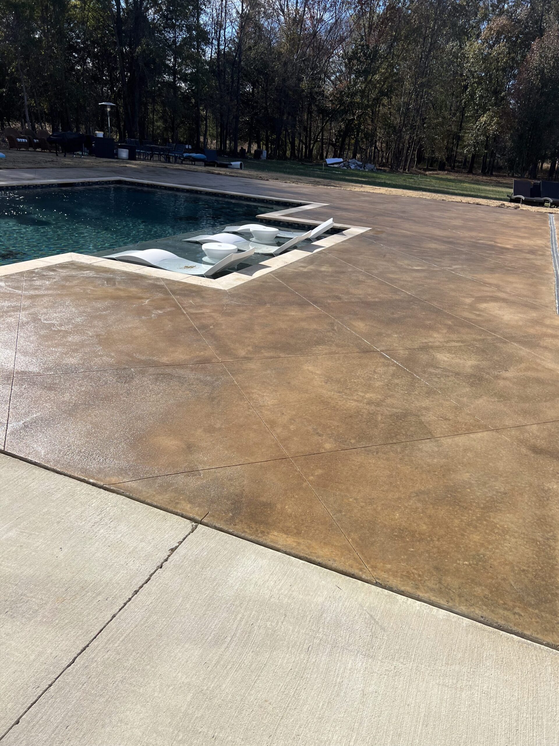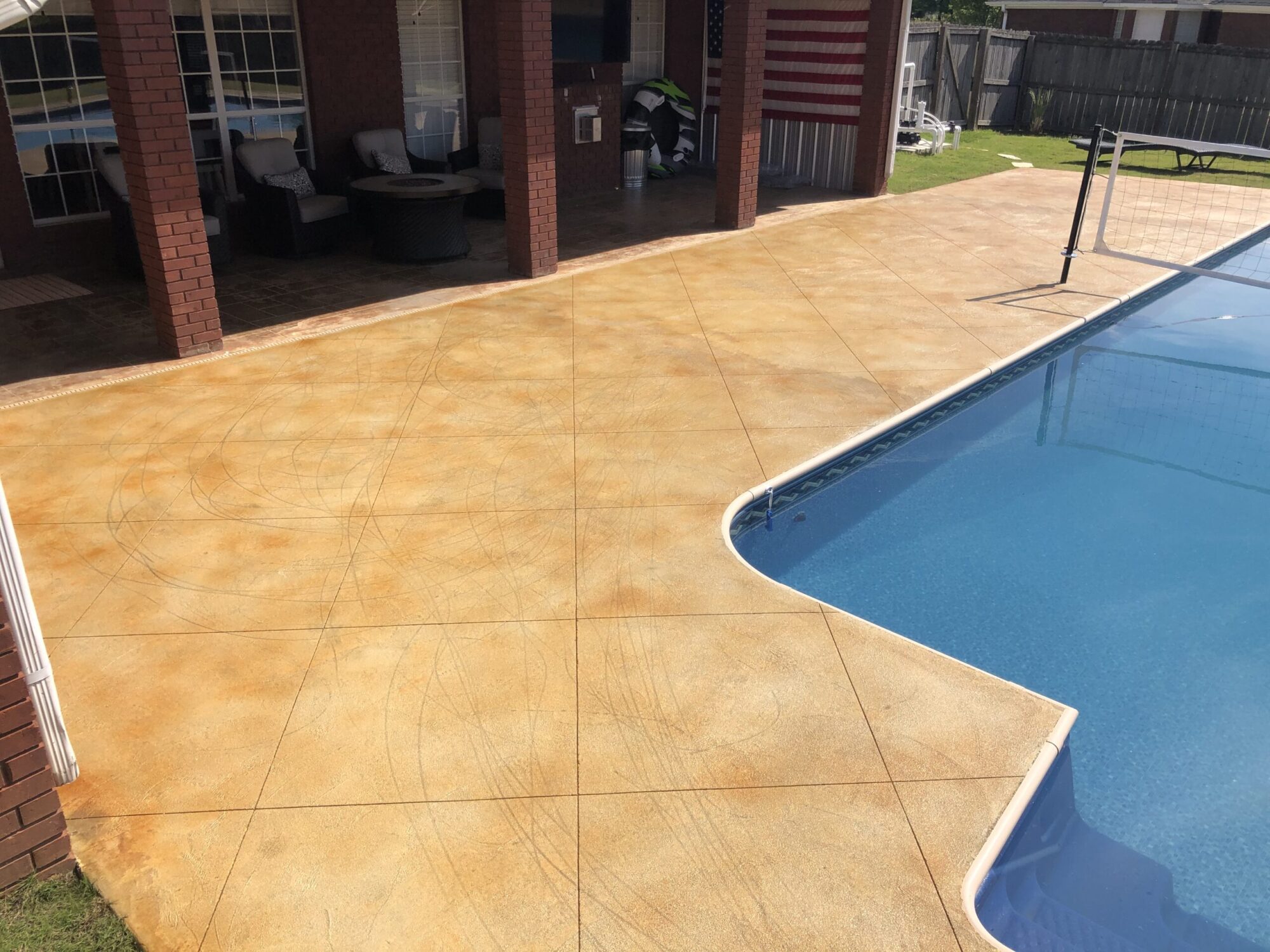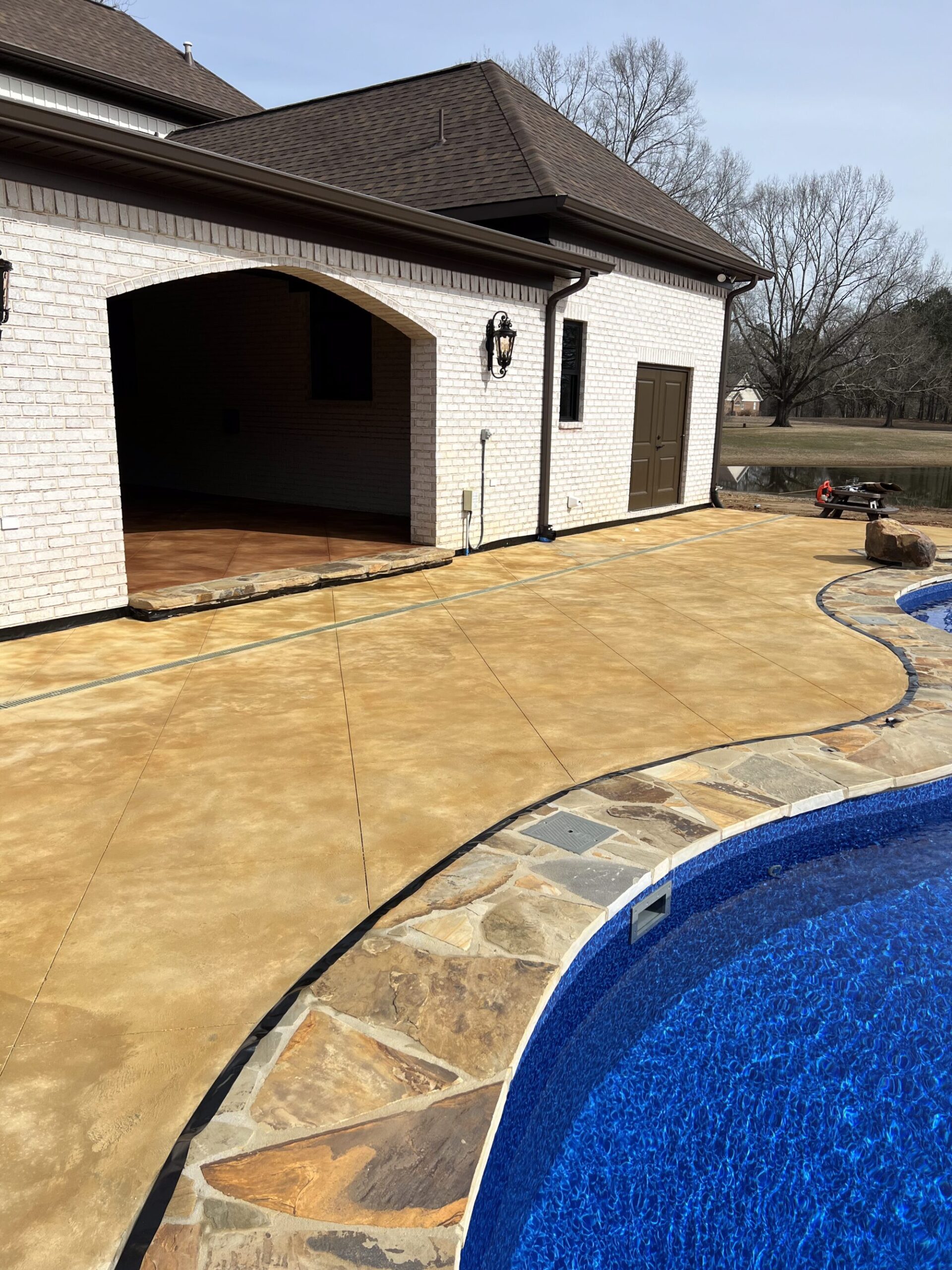 Transform your backyard into a luxury oasis. Browse our pool deck transformations to see the organic, earthy feel our acid-based chemical stains provide. We offer a beautiful range of color options, including rich tans, browns, terracottas, and soft blue-greens. Because our acid stain works with your concrete’s unique features to form a permanent bond, these luxurious finishes withstand the elements and will not break down from pool chlorine, ensuring a lifetime of beauty when properly maintained.